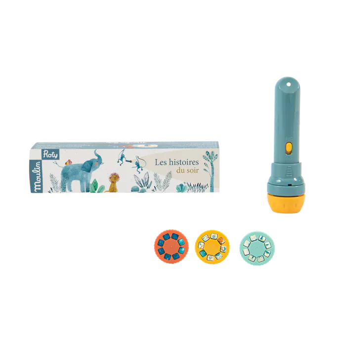 Caixa com lanterna e 3 discos, com 3 histórias diferentes para serem projectadas e contadas