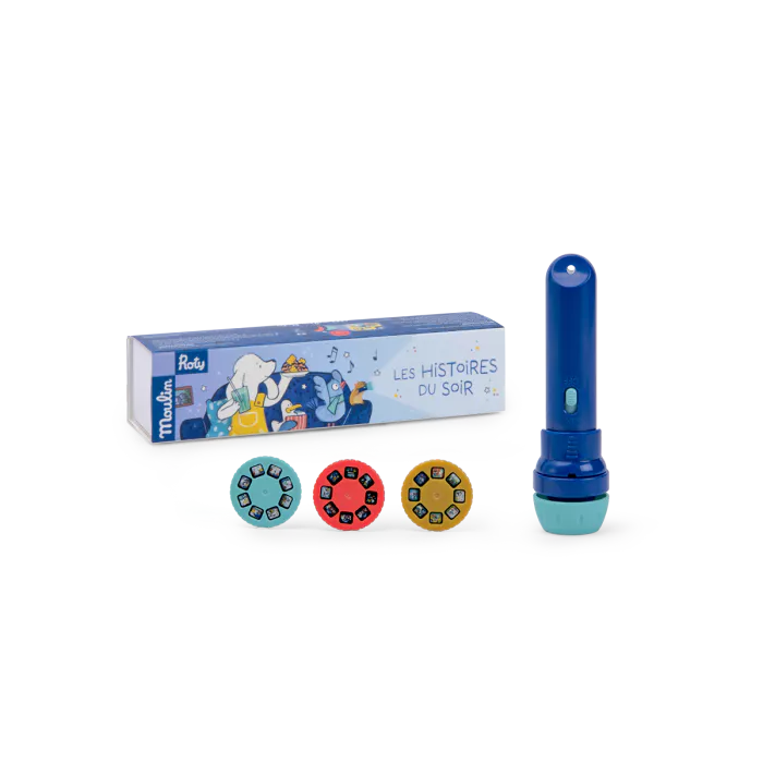 Caixa com lanterna e 3 discos, com 3 histórias diferentes para serem projectadas e contadas